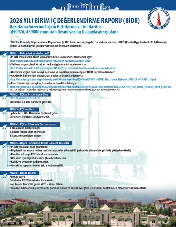 Akademik ve idari birimlere yönelik 2026 Yılı Birim İç Değerlendirme Raporu (BİDR) hazırlama sürecine ilişkin hatırlatma ve yol haritası Kalite Koordinatörlüğü tarafından paylaşılmıştır.